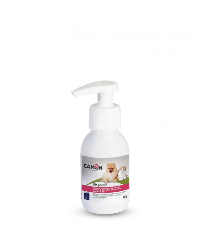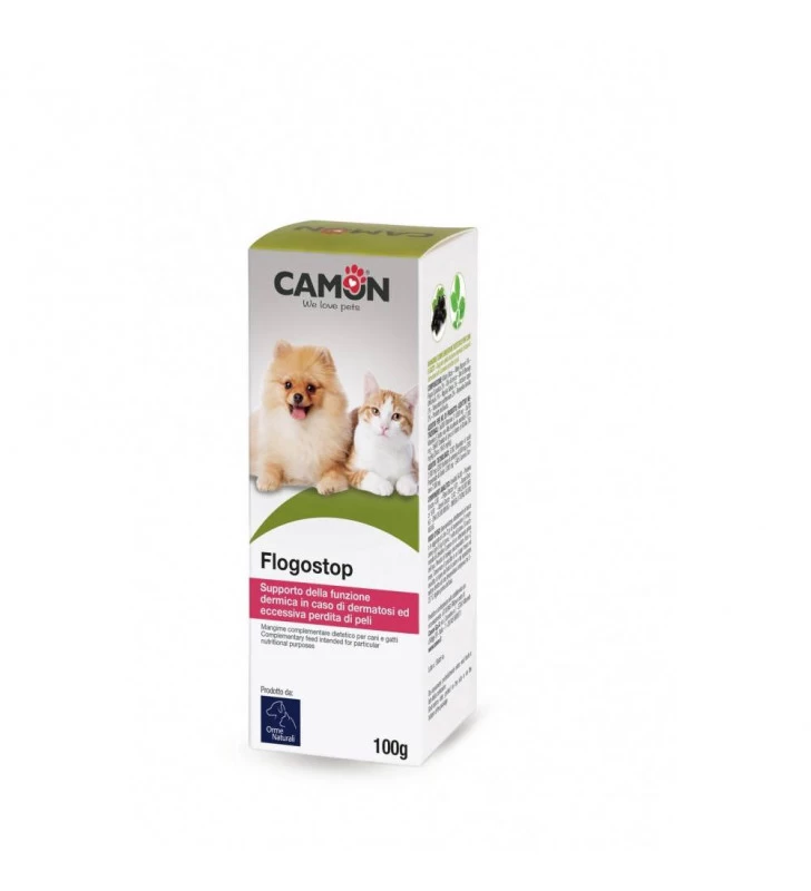 Flogostop è un mangime complementare dietetico per cani e gatti che agisce come supporto alla funzione dermica in caso di dermatosi ed eccessiva perdita di peli, arrossamento, prurito e cattivo odore della cute.
