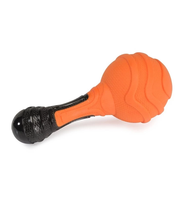 Divertente gioco per cani nella forma di un manubrio realizzato in TPR con una palla, nella doppia colorazione nera e arancione.