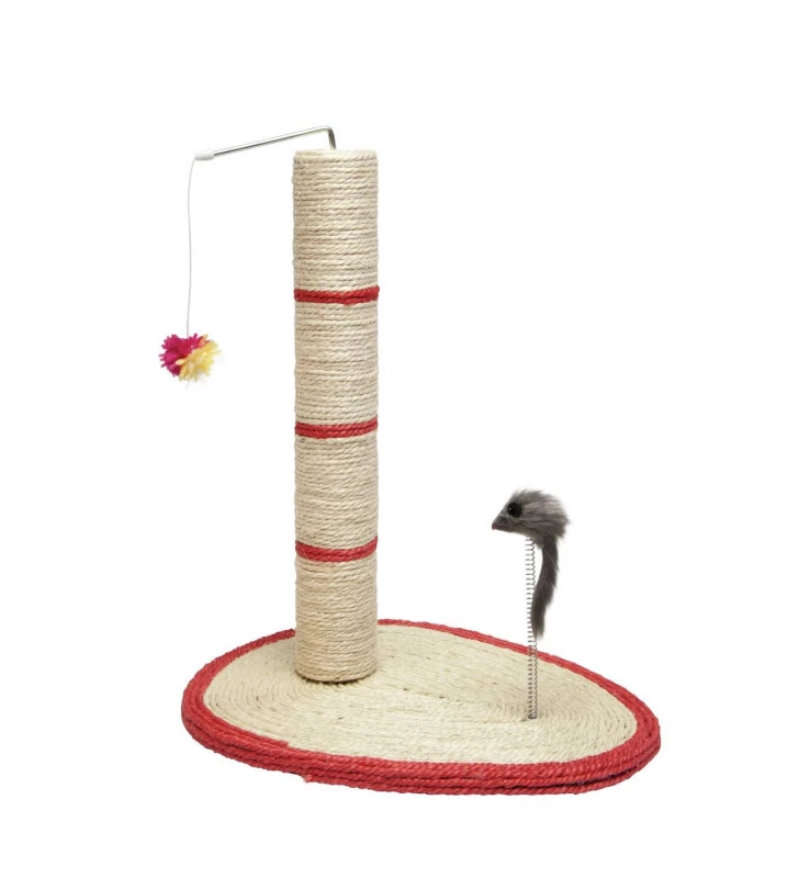 Questo tiragraffi a colonna in sisal, con base ovale, consente al gatto di stiracchiarsi e graffiare a piacimento ed in più di divertirsi con il simpatico pon-pon appeso.
