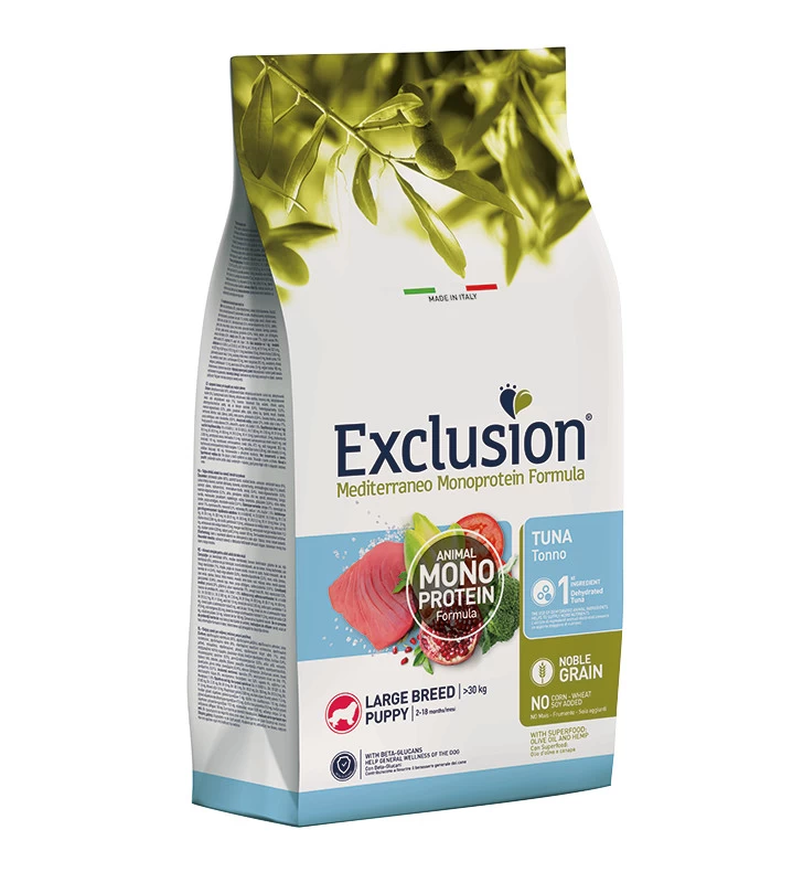 Formulato con un’unica fonte proteica animale disidratata per un maggior apporto di nutrienti, Exclusion Mediterraneo Puppy Large Breed Pollo contiene un unico cereale nobile di alta qualità ed è privo di mais, frumento e soia.