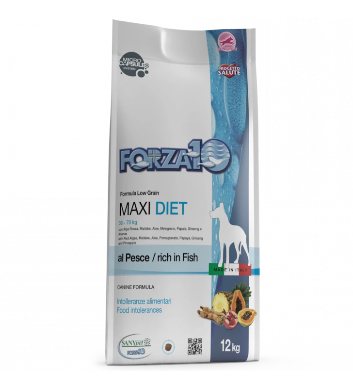Forza 10 Maxi Diet al pesce è la referenza della Linea Dietetica studiata da SANYpet per soddisfare tutti i cani affetti da ipersensibilità alla carne, specie se derivante da allevamento intensivo.