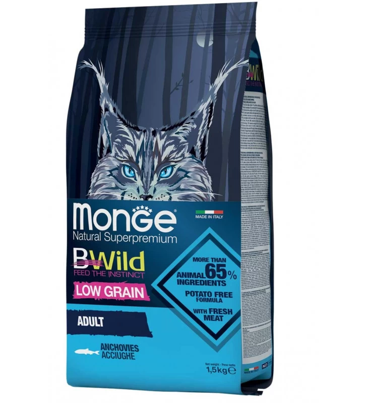 I croccantini Monge BWild Adult alle Acciughe sono un alimento completo per gatti adulti. La carne di acciughe è un’ottima fonte di proteine di qualità e altamente digeribile. Il gusto intenso e caratteristico saprà soddisfare i palati più fini. Hanno un ridotto contenuto di carboidrati e più carne fresca, leggera e digeribile, selezionata in modo specifico per la linea. Contengono vitamine A e C per un pelo sano e lucente e avena per la salute dell’intestino. Il gusto delizioso è garantito anche da frutti ed erbe della foresta, ricche fonti di elementi nutritivi preziosi e fibre naturali indispensabili per una corretta alimentazione. Garantiscono il benessere dell’animale rispettando il suo naturale istinto.