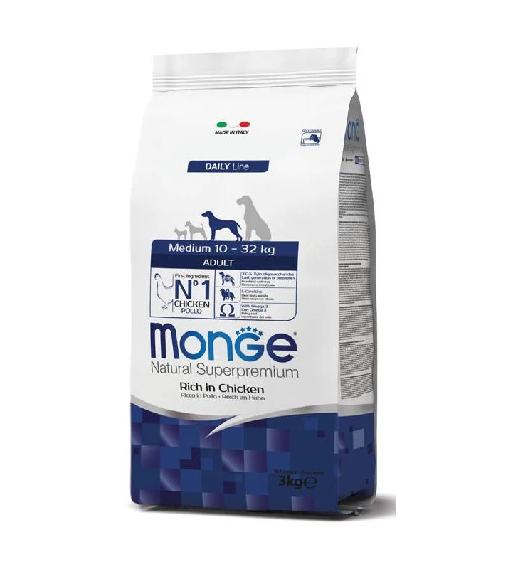 Monge Natural Superpremium Medium Adult Ricco in Pollo è un alimento completo per cani adulti di taglia media (10-32 kg).
