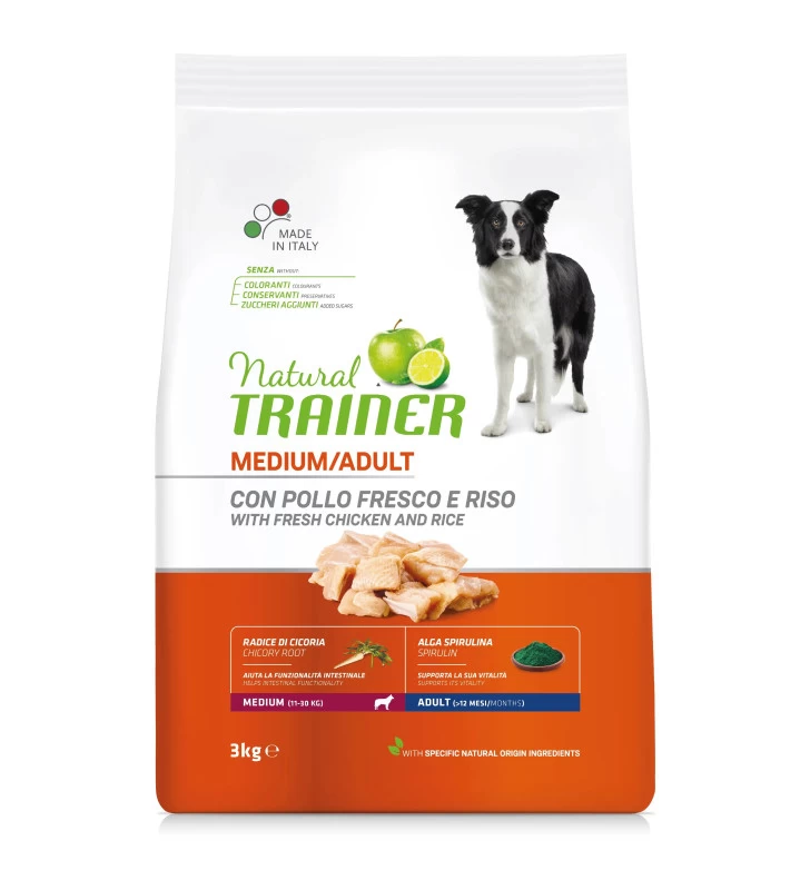 Natural Trainer Medium Adult con Pollo fresco & Riso è un alimento secco, preparato con componenti specifici di origine naturale, in grado di soddisfare le specifiche esigenze nutrizionali dei cani adulti (dai 12 mesi ai 7 anni di età) di taglia media per favorire il suo benessere generale.