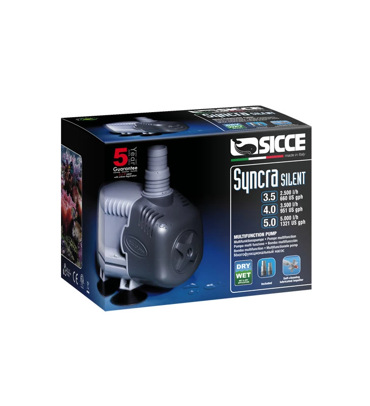 Syncra Silent è una nuova linea di pompe di ultima generazione realizzate per unire le alte prestazioni, l’estrema silenziosità ed efficienza energetica. La tecnologia innovativa permette l’uso di questa linea di pompe in un’ampia varietà di applicazioni. Le pompe Syncra Silent sono ideali per l’utilizzo in acquario d’acqua dolce e marina, tartarughiere, reattori di calcio, water cooling e in qualsiasi applicazione che richieda una pompa ad alte prestazioni ma totalmente silenziosa. Tutta la linea può essere utilizzata in applicazione Wet & Dry, grazie ad una protezione termica che ne evita il surriscaldamento. La tecnologia di Sicce ha evoluto l’utilizzo del motore sincrono al design, all’affidabilità e ad una silenziosità del 100%.